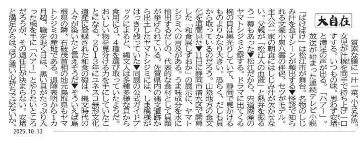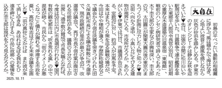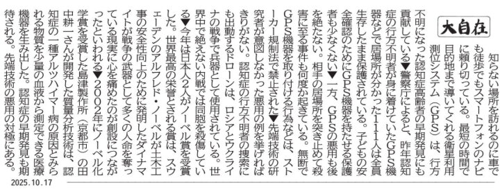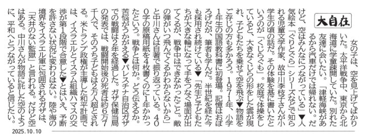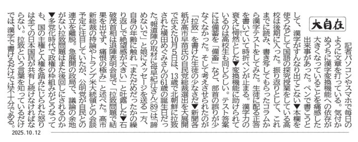 静岡新聞の朝刊1面には毎日、コラム「大自在」が載っています。取材経験 豊富な記者が国民、県民の注目が集まる事柄を取り上げて書いています。内容は示唆に富み、文章の勉強にも役立ちます。シートを取り出して書き写しに挑戦してみましょう。
