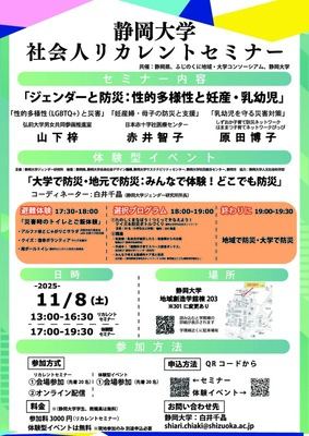 静岡大学では、「ジェンダーと防災」をテーマに、セミナーと体験型イベントを開催します。セミナーはオンライン参加も可、体験型イベントは地元、大学、専門家が連携して開催します。