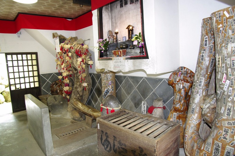 境内には男性・女性のシンボルの形をした「おさすり」「おまたぎ」と呼ばれるモニュメントがあり、これをさすったり、またいだりすると、一生下の病気にかからないという言い伝えがあります。祭りではトイレの壁に貼るお札や祈祷済みのパンツも販売され、大変にぎわいます。