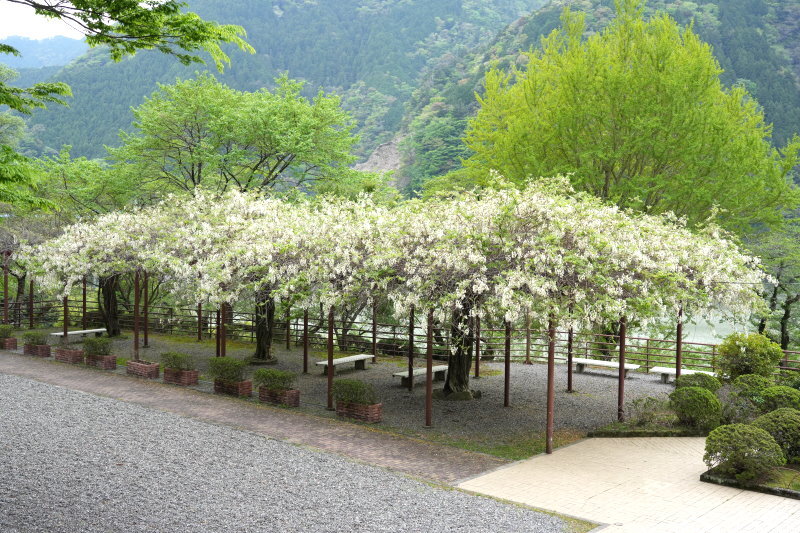 かつてこの藤棚から昭和天皇皇后両陛下がダム湖面を眺めたこともあります。幹がすでに空洞化していますが、まだまだ白い花の房をしっかり膨らませています。湖岸広場に着いたら目線を右上に向けてください。階段を登って行くと太い藤と白藤の古木が頑張って花を咲かせています。