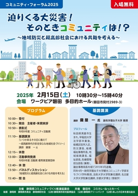 今年は「迫りくる大災害!そのときコミュニティは!?」~地域防災と超高齢社会における共助を考える~をテーマに、跡見学園女子大学の鍵屋 一 様をお迎えし、災害の中の地域コミュ二ティについて講演していただきます。