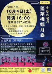 世界一長い木造歩道橋「蓬莱橋」をバックに中秋の名月と民謡やゴスペルなどの演奏をお楽しみください。