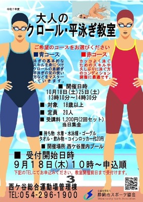 大人のクロール・平泳ぎ教室(コースが2つあるよ)