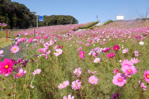 袋井市では、地域住民の協力のもと、市内各所にコスモスの花を咲かせる取り組みを行っています。