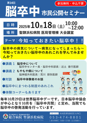 「第14回 脳卒中市民公開セミナー」を開催します。今回のテーマは「今知っておきたい脳卒中!!」。医師による講演、対談、体験コーナーを通して正しく学びましょう。