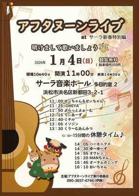 アマチュアミュージシャン13組によるアコースティックライブです。フォークソングを始めポップスや歌謡曲など懐かしい歌を演奏し唄います。お正月にふさわしい楽しいライブです。観覧無料、ご予約不要、途中入退室オーケーです。どうぞお気軽にいらして下さいね。