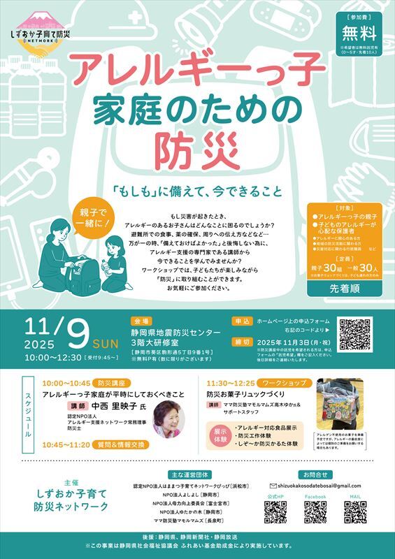 今回の防災講座では、災害時にどのようなことが起こり得るのか、アレルギーを持つ子どもとその家族にとってどのような備えが必要なのか、過去の災害事例などを交えてお話いただきます。