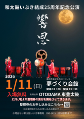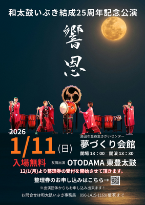 島田市で活動する和太鼓いぶきの結成25周年を記念して開催する入場無料の自主公演です。今回はゲストに静岡市を拠点に活動するOTODAMAと東豊太鼓をお招きし和太鼓の魅力を楽しめるコンサートになっています!