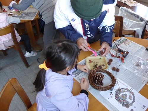 つるのリース土台に数種類の木の実やリボンなどお好きなものを選んで飾り付けをして、オリジナルのクリスマスリースを作ります。各時間帯5個制作。定員になり次第受付終了致します。