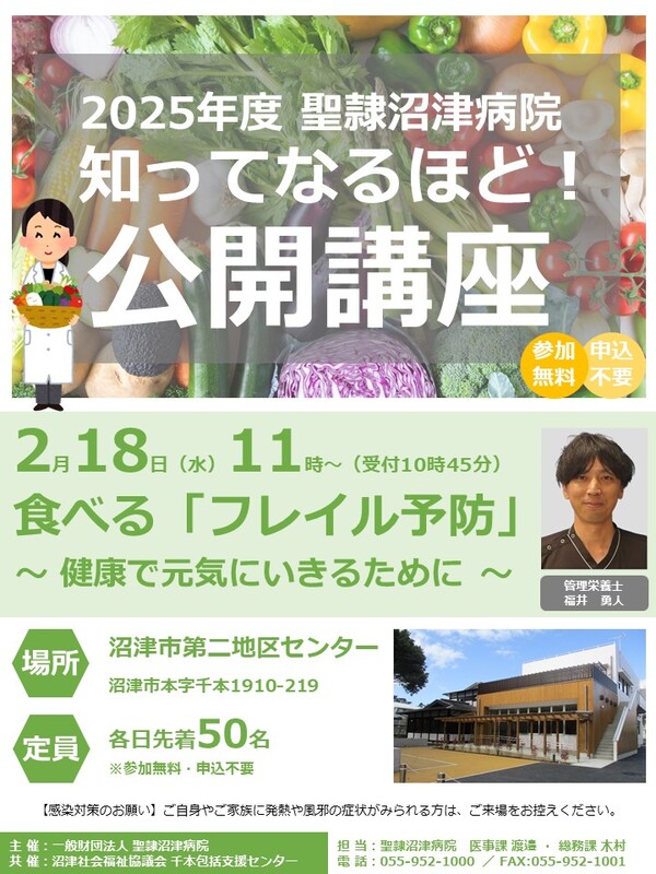 聖隷沼津病院主催で2/18に公開講座を開催。管理栄養士がフレイル予防をテーマに、低栄養を防ぐ食事の工夫や、元気に過ごすためのポイントをわかりやすく解説します。