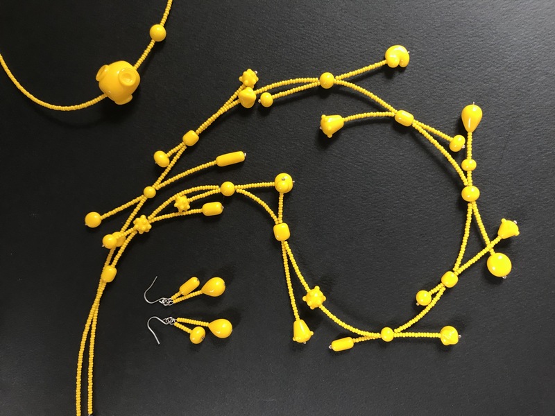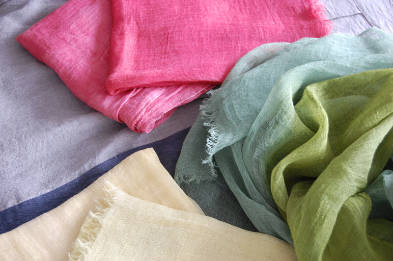 前半はグラスビーズ作家の宮野美樹さん、インド更紗の服作りの作家、小林順子さん、リネンガーゼを自然染めしてストールや服をプロデュースする青山修子さんの3名による作品展『春呼ぶ装い」