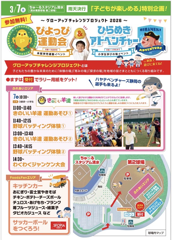 グローアップチャレンジプロジェクト2026「ぴよっぴ運動会」&「ひらめきアドベンチャー」をちゅ〜るスタジアム清水で開催!