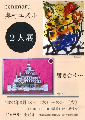 コンピューターでアート作品を描くbenimaruと、ヨーロッパの風景を明るいタッチで描く奥村ユズル、二人の作品を展示する絵画展です。