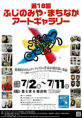 JR富士宮駅から西富士宮駅まで続く6商店街で開かれるアートギャラリーです。総勢50名以上のアーティストが集結、作家と地元の学生作品やアート体験教室、味体験グルメ、小学生絵画コンクール、富士宮の商店街が芸術空間に変わります。