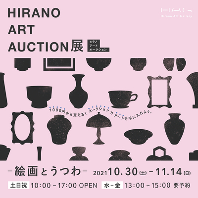 このたびHirano Art Galleryでは、『HIRANO ART AUCTION展 -絵画とうつわ-』を開催いたします。1000円からどなたでも参加できるオークションです。油絵や版画を中心とした絵画作品や、陶器やガラス作品など、幅広い作品を出品いたします。また、会場内の併設ショップで、北欧食器や古伊万里焼、漆器などのお買い物もできます。