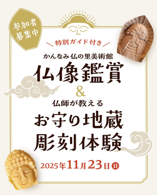 国指定重要文化財の阿弥陀三尊像をはじめ、計24体の貴重な仏像を展示している「かんなみ仏の里美術館」で仏像鑑賞後、仏師指導のもと、手のひらサイズの木製お守り地蔵を彫ります。