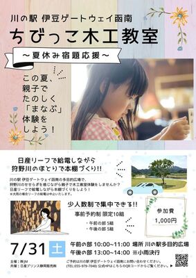川の駅 伊豆ゲートウェイ函南の多目的広場で、狩野川のせせらぎを感じながら親子で木工教室体験をしませんか?日産リーフで給電しながら本棚づくりをしよう!