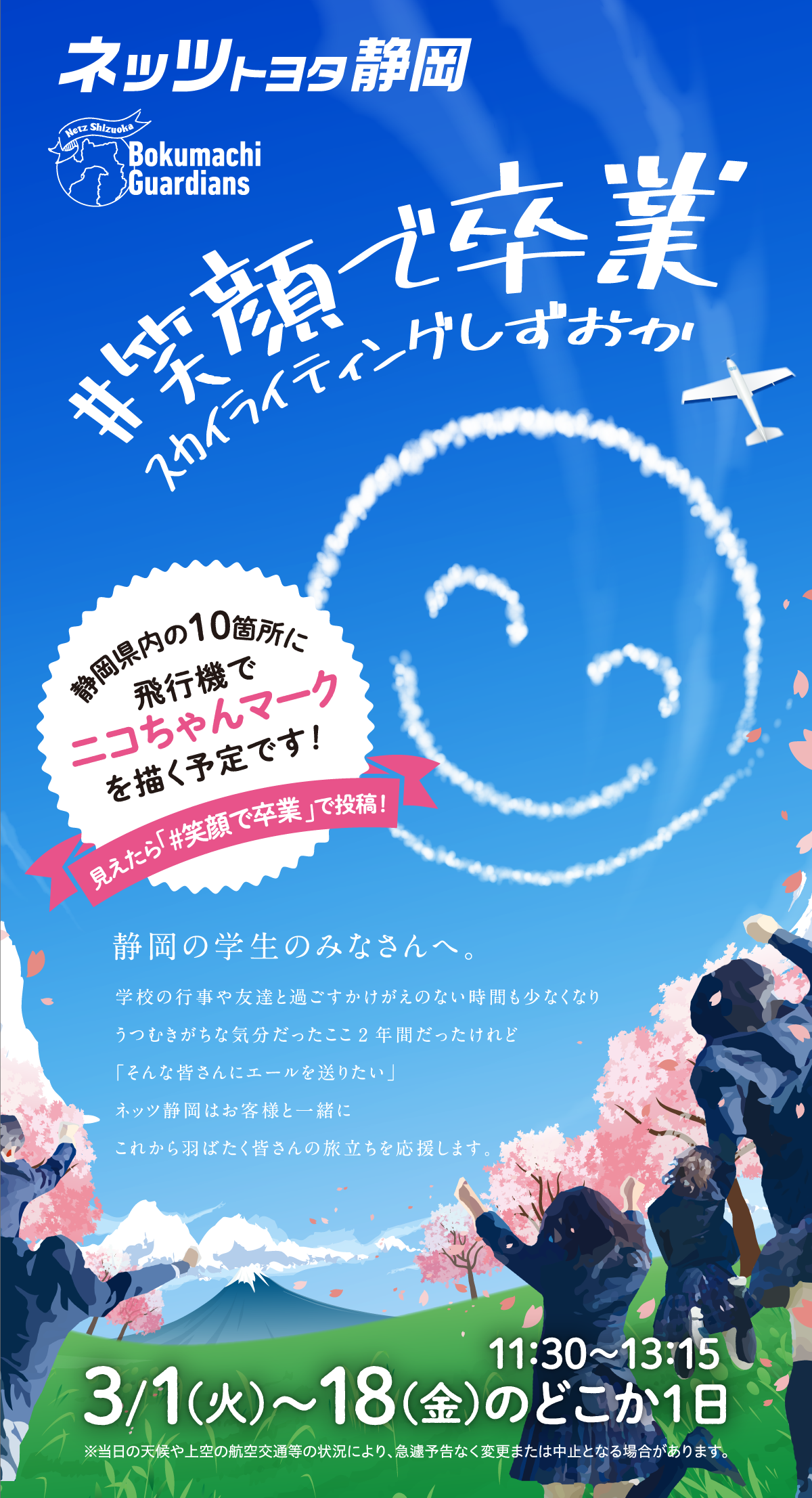 この取り組みの一環で、「#笑顔で卒業 スカイライティングしずおか」という、主にこの春に学校を卒業する学生向けに、3/1〜18のどこか1日、エールの意味を込めてお空にニコちゃんマークを描くプロジェクトが実施される模様。