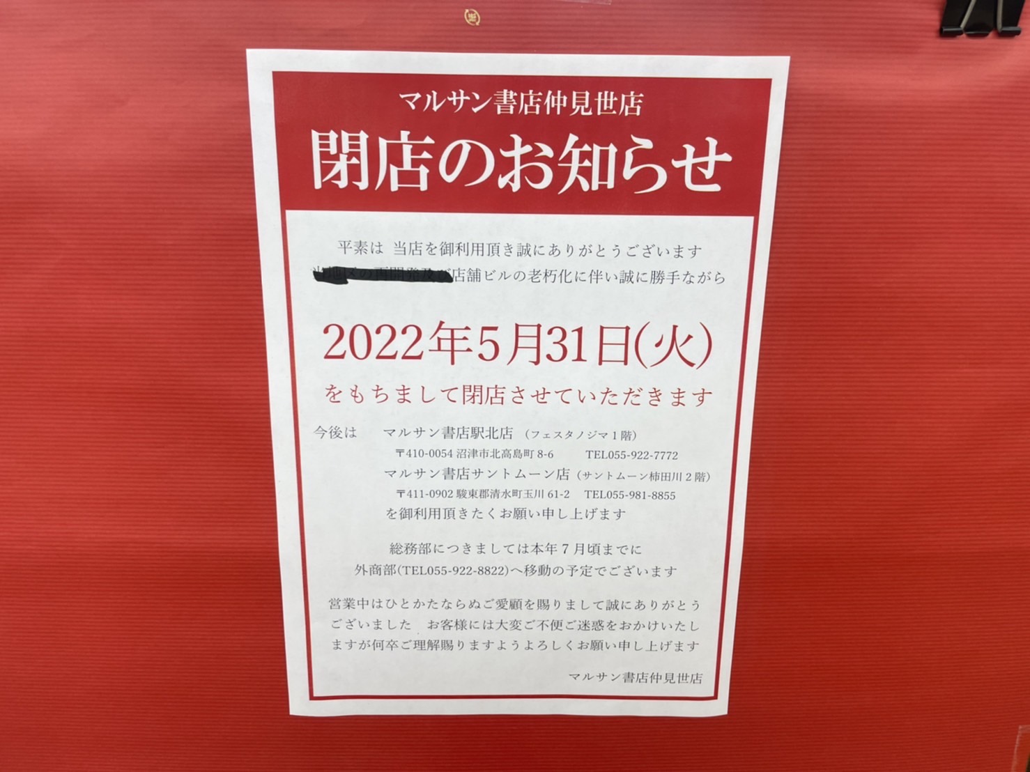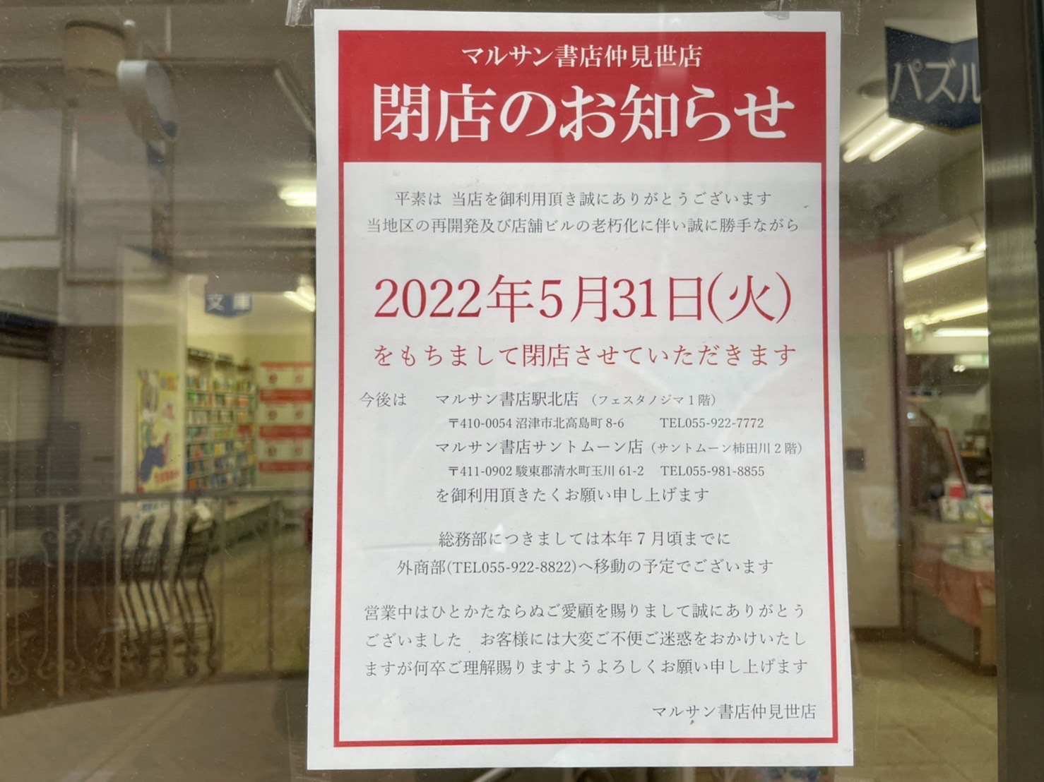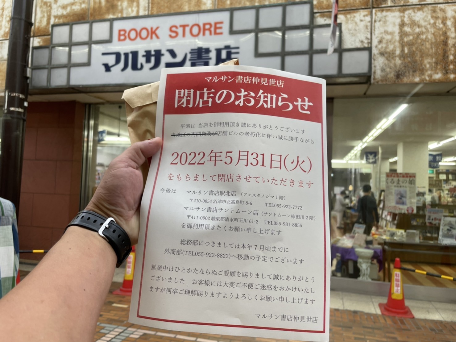 マルサン書店仲見世店閉店のお知らせをいただいた。ぬまつー基地で大切に保管させていただきます(´;ω;`)ウゥゥ。