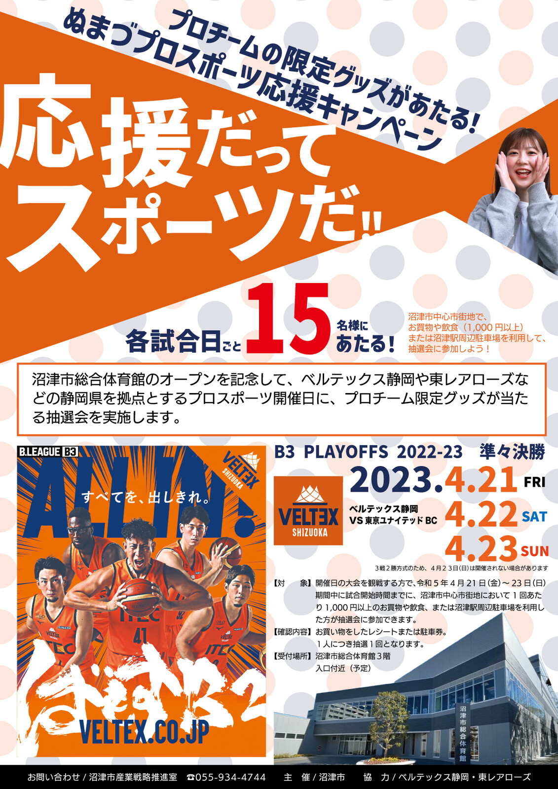 そんなベルテックスの大事な試合を盛り上げようと、ゲームを観戦しつつ、沼津の中心市街地でお買い物をするとベルテックス静岡の限定グッズがあたるキャンペーンが開催されるそうです。