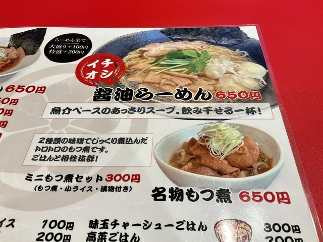 醤油らーめん650円、ミニもつ煮セット300円で計950円也。