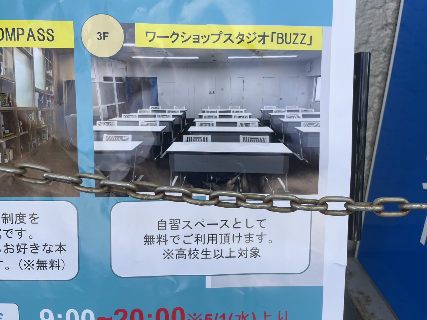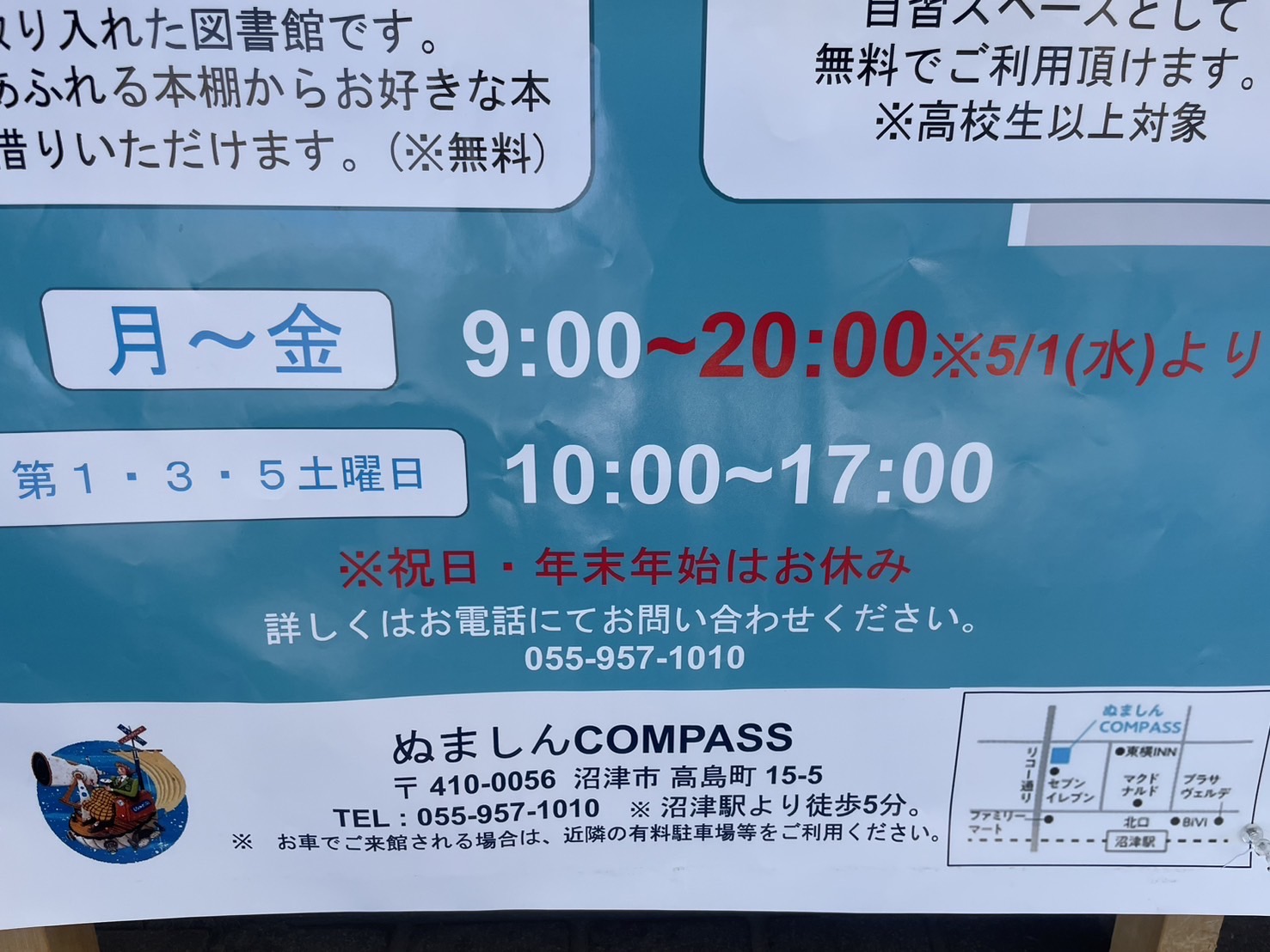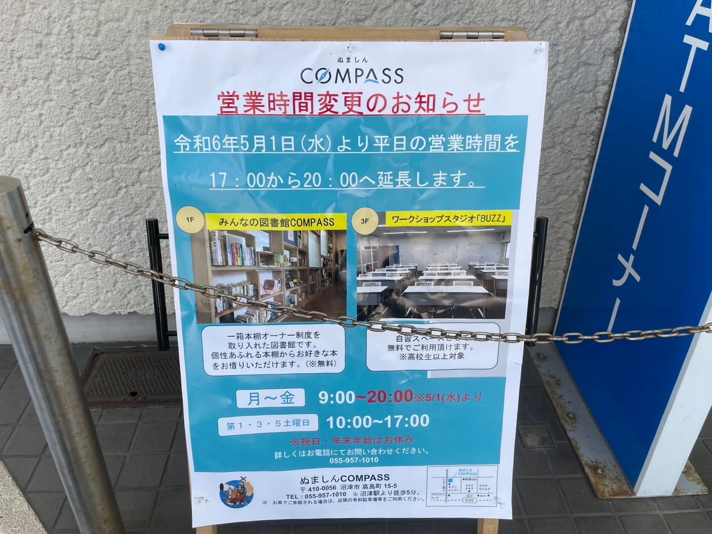 みんなの図書館COMPASSは、本のコトだけじゃなくて沼津や静岡県東部のことを色々発信しているので、情報収集のためにもフラっと行ってみるといい。3階にはワークショップスタジオ「BUZZ」があって、なんと高校生以上を対象に、自習スペースとして無料で利用できる。すごい。営業時間は、「月~金 9:00~20:00。第1・3・5土曜日 10:00~17:00 ※祝日・年末年始はお休み」だそう。無料ってすごいな、ぬましん。高校生にとって、静かに勉強できる場所があるって、ほんとうにありがたいと思う。とりあえず、一回のぞいてみるといい。
