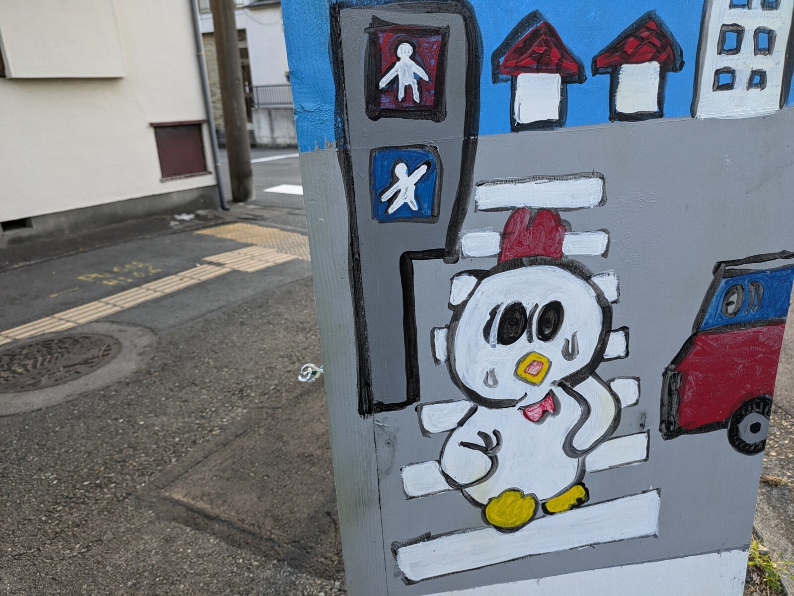 これは、ニワトリ。たぶん、ニワトリ。めっちゃ汗かいてるニワトリ。人も車も(ニワトリも)気をつけて横断歩道をわたりましょう。素敵な看板がたくさん見つかる永代橋通り。夏も楽しくお散歩できます。(たぶん)ニワトリの看板があるあたり