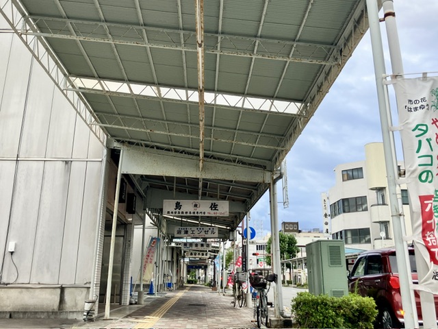 歩道にかかるアーケード、そこにぶらさがる看板。