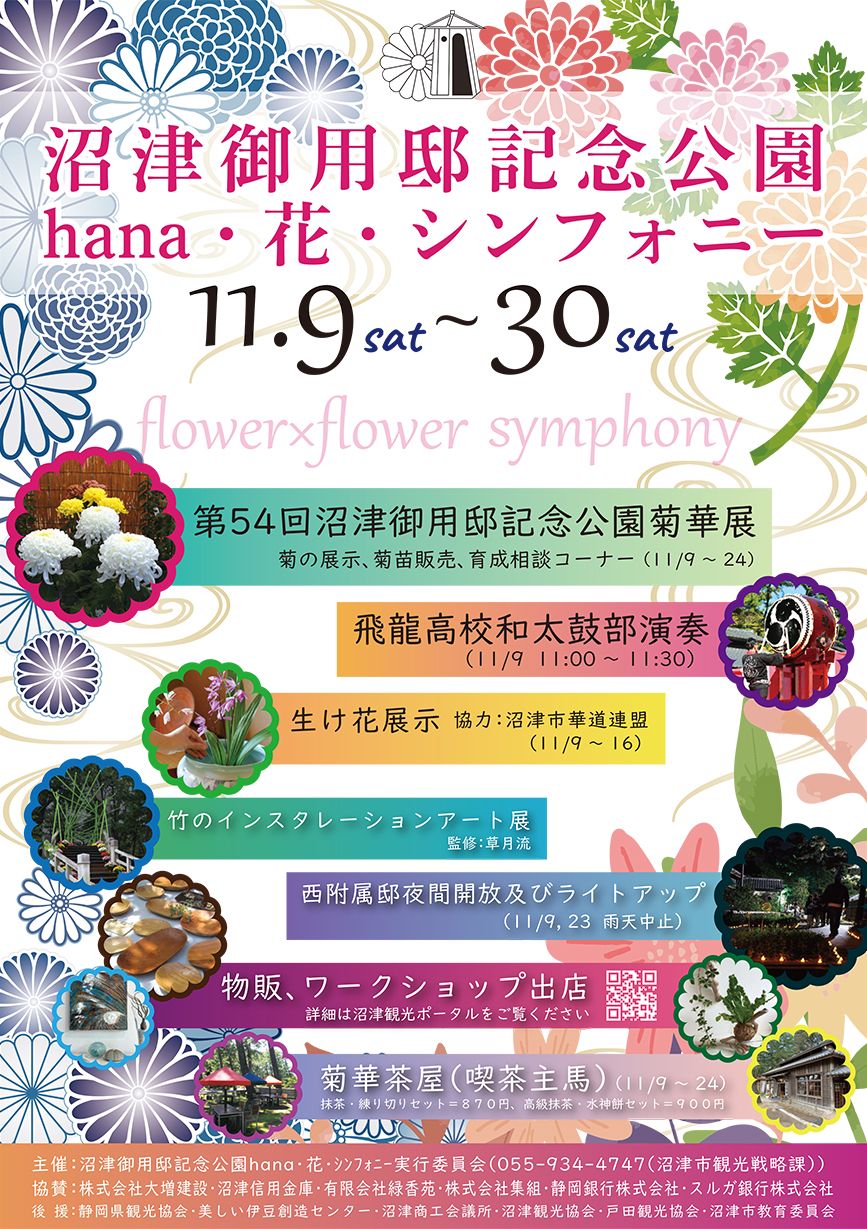 そんな菊華展を中心に、御用邸記念公園では様々なイベントが展開されます。竹のインスタレーションアート、飛龍高校和太鼓部の演奏、ライトアップされた夜間観覧、ワークショップや地元の物産販売も予定されています。