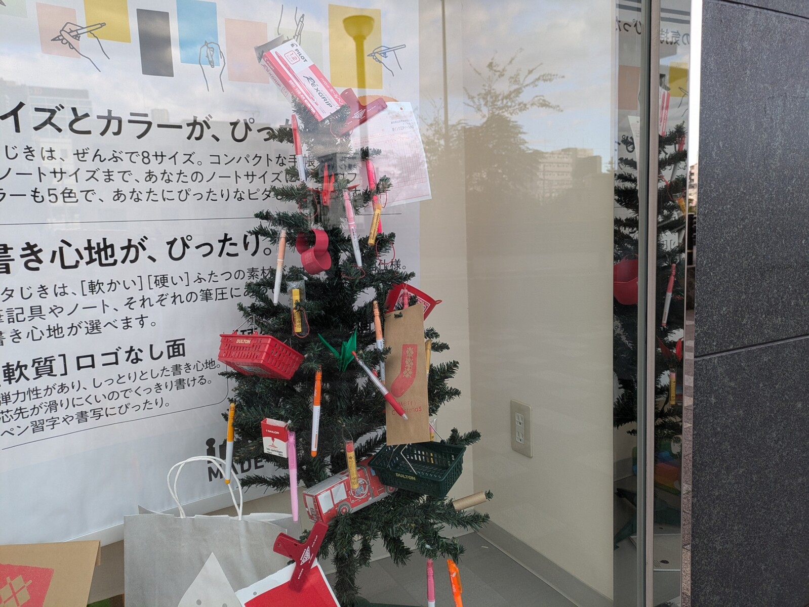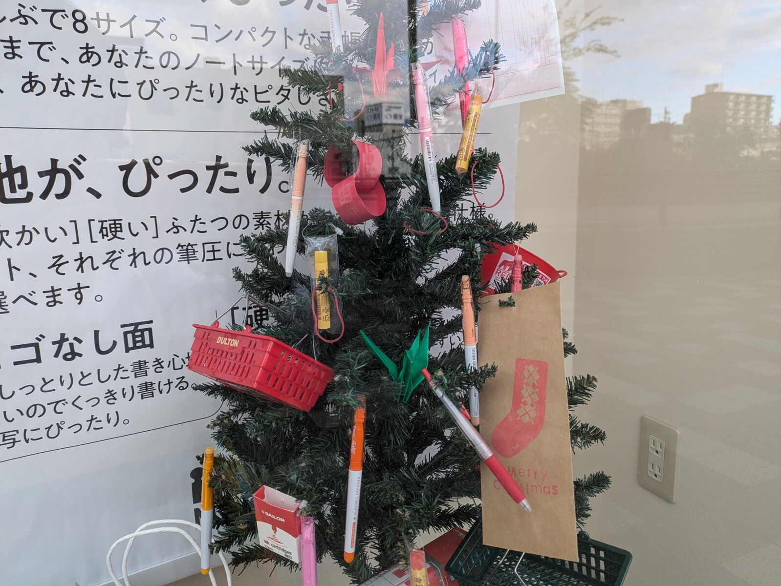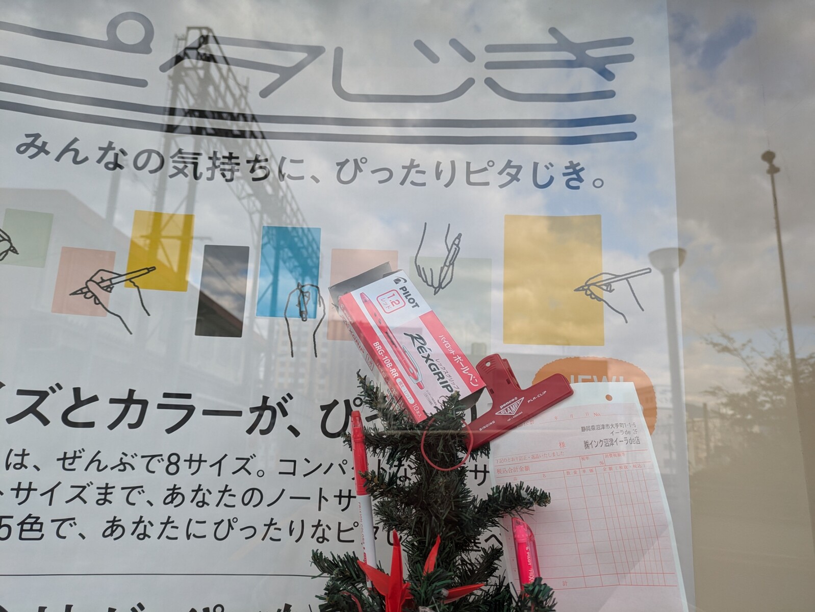 星が鎮座することが多いツリーのてっぺんには、赤ペンの箱がくっついてた。斬新。余談ですが、クリスマスツリーではないんだけど、セブンイレブン沼津白銀店のちかくに、