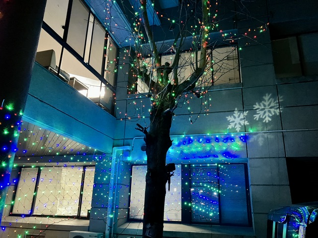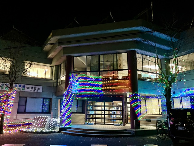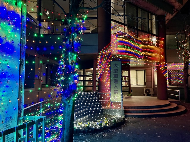 地区センターの入口が色とりどりのイルミネーションで飾られています。