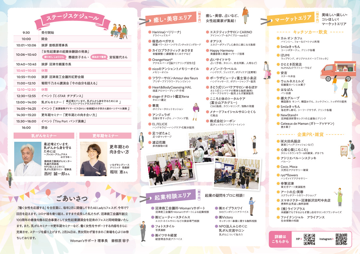 ステージでは、女性起業家による体験談発表、キッズチアダンス、静岡がんセンターの先生による「乳がんから身を守るために」、いながきレディースクリニックによる「更年期との向き合い方」など、多彩な講演もやるみたい。