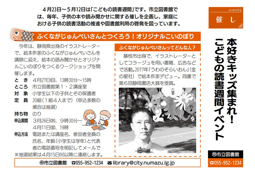 エントリーは明日3月26日の9時30分からスタートして4月11日の金曜日19時まで。持ち物はのり。定員は20組となっています。講座名、参加者全員の氏名と年齢、代表者の連絡先をメールするか、電話でも申し込みできます。詳しくは、広報ぬまづの3月15日号をチェックしてみてね。