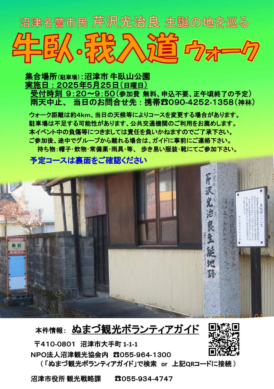 当日は、9時20分から50分の間に牛臥山公園へ。事前予約は不要なので、わらわらと集まってスタートするようです。もちろん参加は無料!暑くなるかもしれないので帽子や飲み物はお忘れなく!詳細はぬまづ観光ボランティアガイドのホームページをチェックしてね。