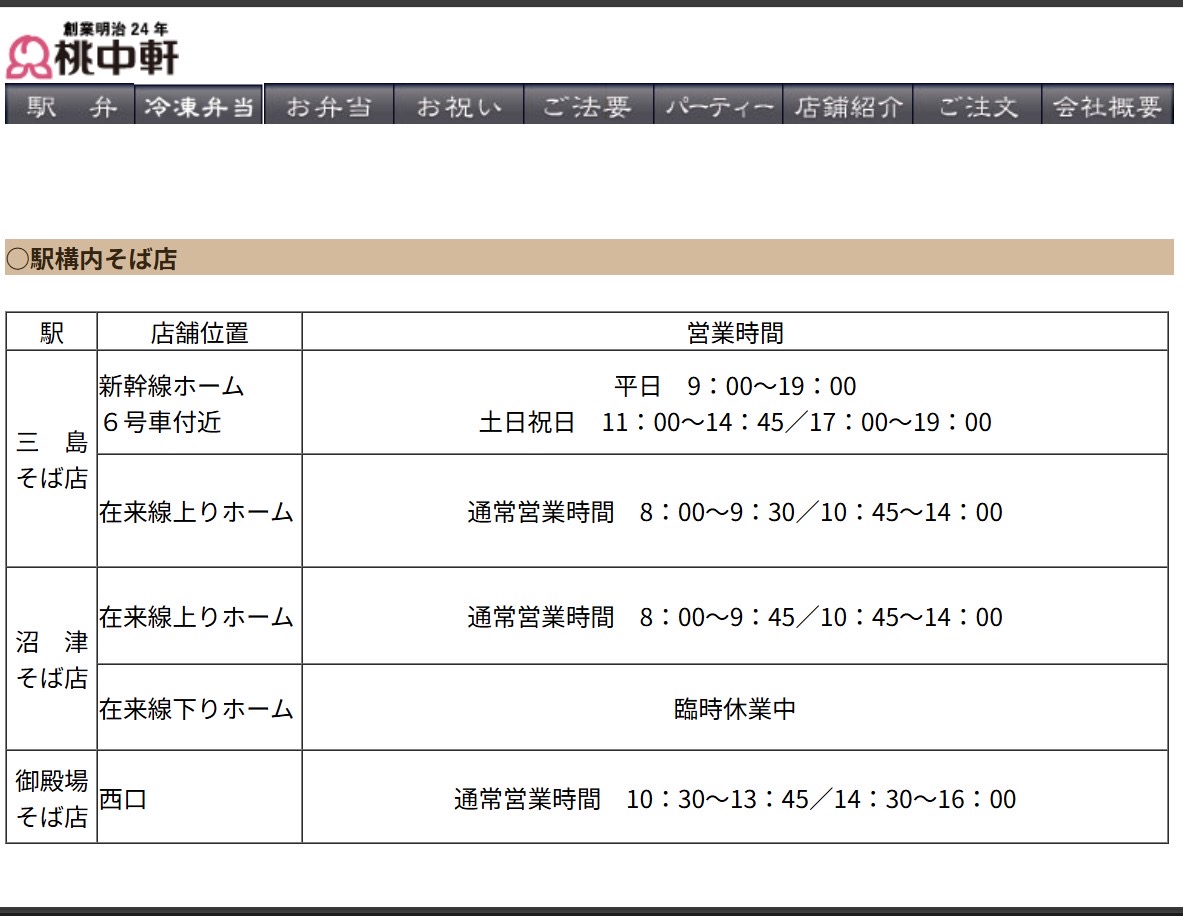 のんべえ@ぬまつーは、駅そばに入っているネギが、どの地域から青ネギか白ネギかで変わるのか、沼津周辺の駅を食べ歩き検証したことがある笑。めっちゃマニアック笑。ちなみに、しまやん@ぬまつーは、うどんが好き。のんべえ@ぬまつーは、そばが好き。桃中軒三島駅新幹線ホーム店の営業時間は、9:00~19:00だそう。ほかの駅構内そば店の営業時間はこちら↓