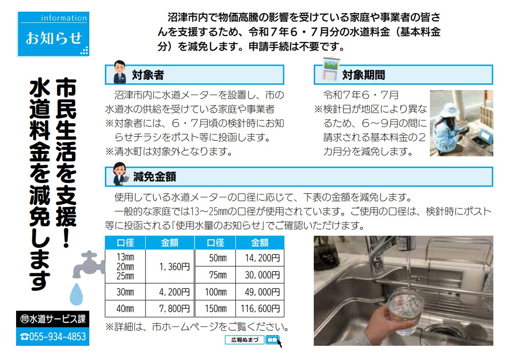 まえーに広報ぬまづに載っていましたが、物価高騰の影響を受けている家庭や事業者を支援するため、6月・7月の水道基本料金が減免されるそうです。ラッキー!!(基本的に沼津市内に水道メーターがある人のみ)