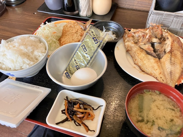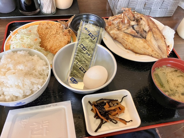 カサゴの干物、アジフライ、納豆、生卵、海苔、しらすおろし、ヒジキ煮、味噌汁、ごはん。