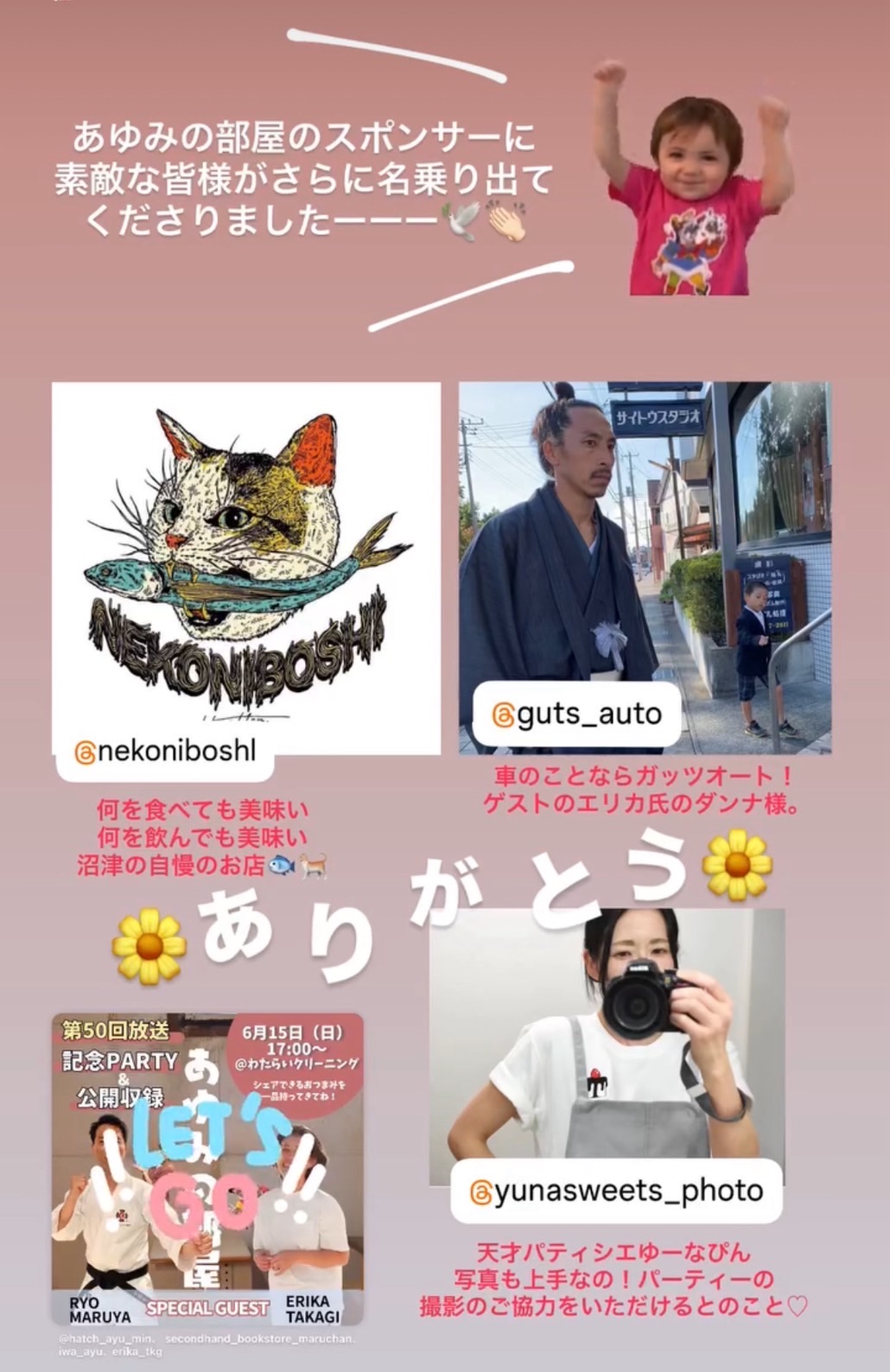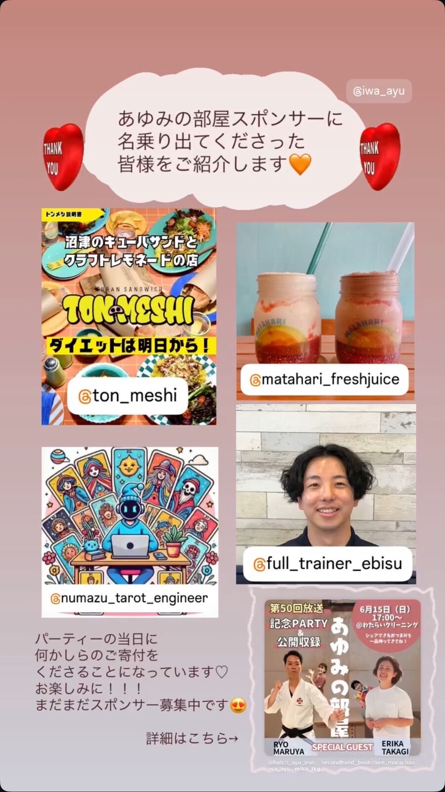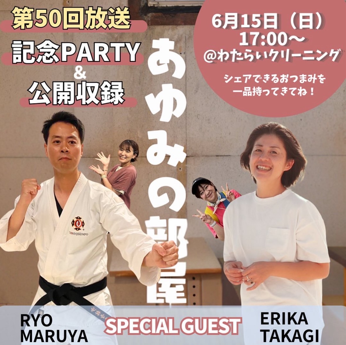 第50回放送を記念して、まるやりょうさん(古本屋まるちゃん)と、たかぎえりかさん(占い師)をゲストに迎えてあゆみの部屋ラジオの公開収録をするんだって。