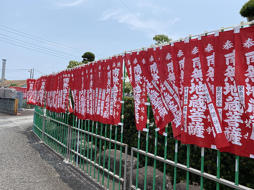 今年のお地蔵さんのおまつりは7月20日に開催予定で、すでに朱色ののぼりがスタンバイしていました。