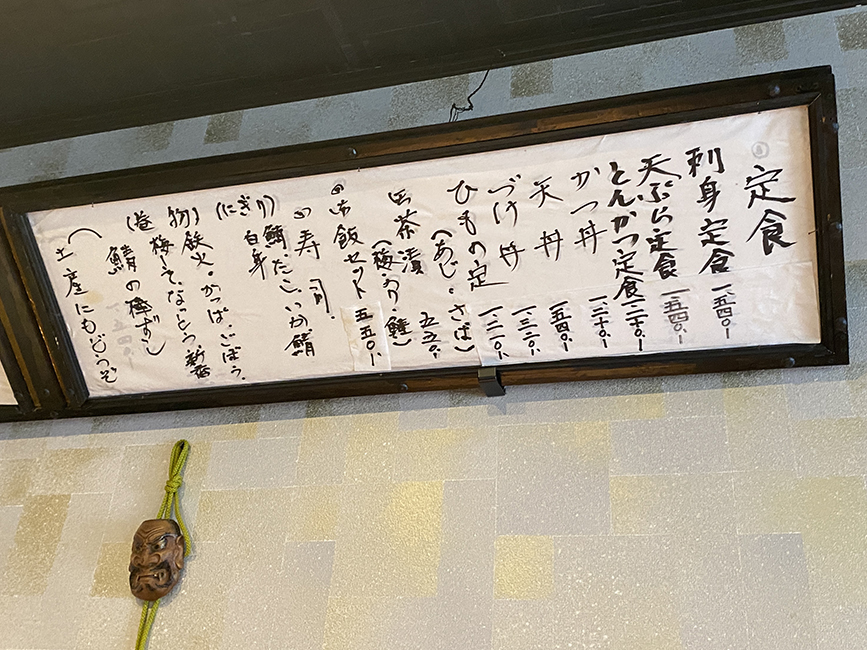 入店するなり、女将さんが「レギュラーメニューの定食より日替わりランチメニューのほうがボリュームもあっておトクですよ~」なんてサジェストしてくれるもんだから、壁にかかっているメニューを眺めながらも日替わりランチ(メンチカツ&お刺身)をオーダー。