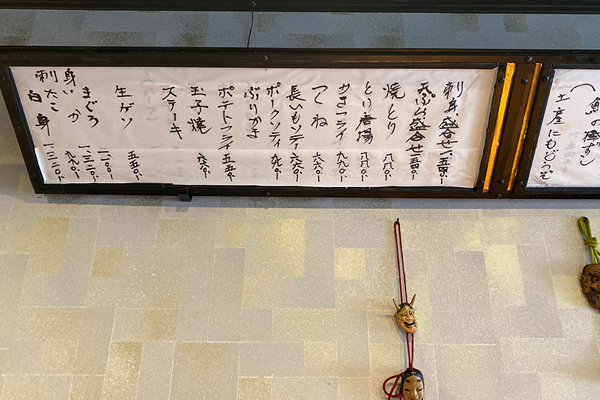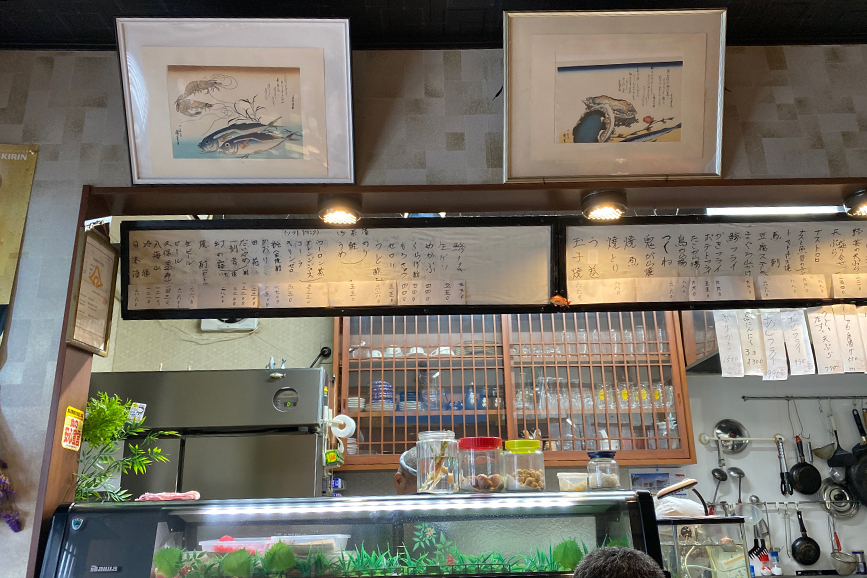 ひもの定食も気になるなー。次に来たときは頼んでみようかしら。厨房の前にもメニューが貼ってあって、かなり充実した居酒屋メニューが並びます。カウンターで一人飲み、とかもシブくていい感じ。夜も来てみたいな~。