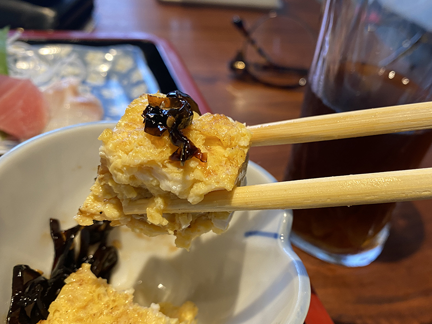 小鉢の卵焼きには昆布の佃煮が沿えられています。ちょうどいい塩味がたまりません。