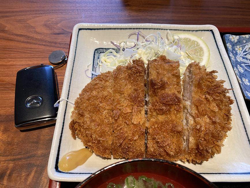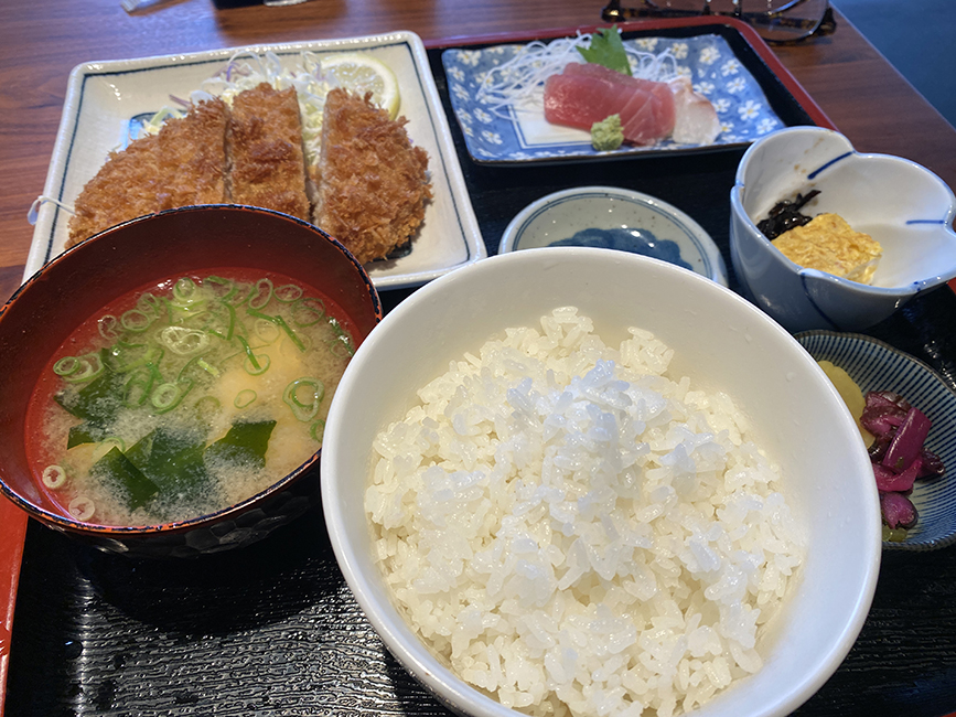 待つこと数分、女将さんの言葉どおり、デカっと呟いてしまうほどのメンチカツにお刺身、小鉢にお味噌汁と香の物、大きめのお茶碗に入ったご飯が並べられます。