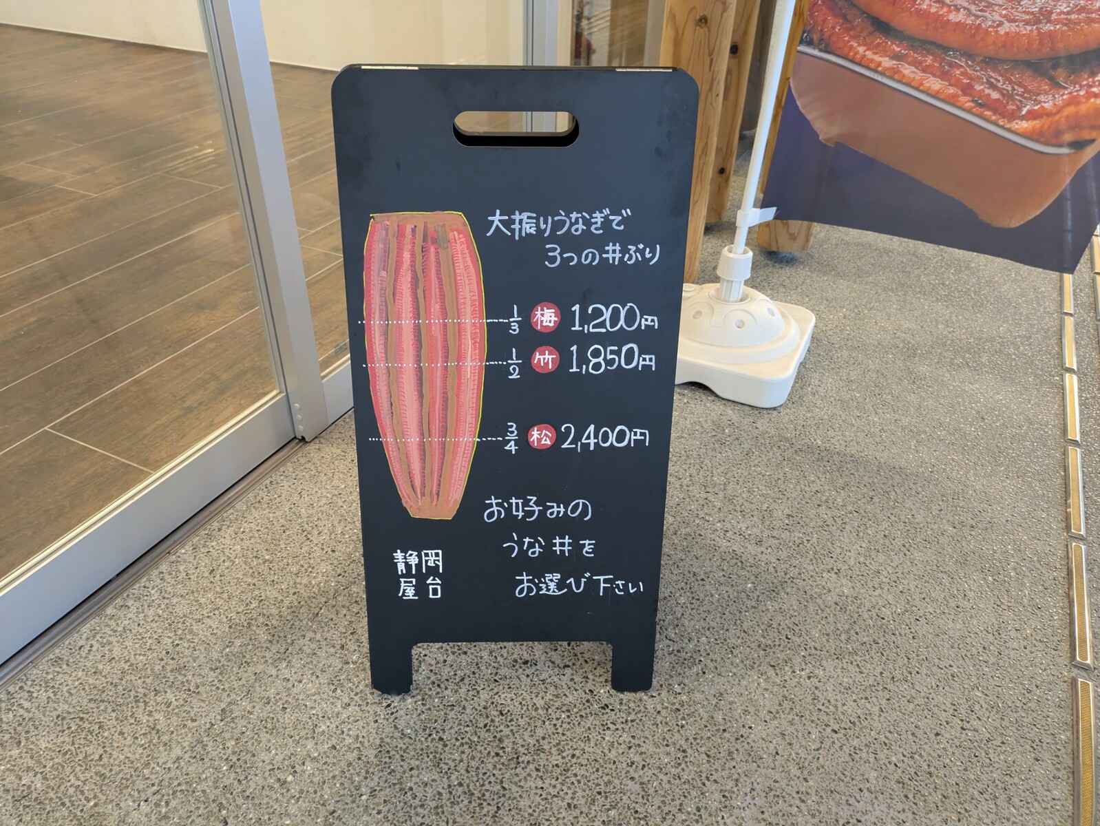 うな丼のうなぎの大きさが3段階で選べるらしい。 3/4のうなぎが乗ってる「松」でも2400円。「大衆うなぎ」って言葉通り、お手頃価格な気がします。ありがたい。