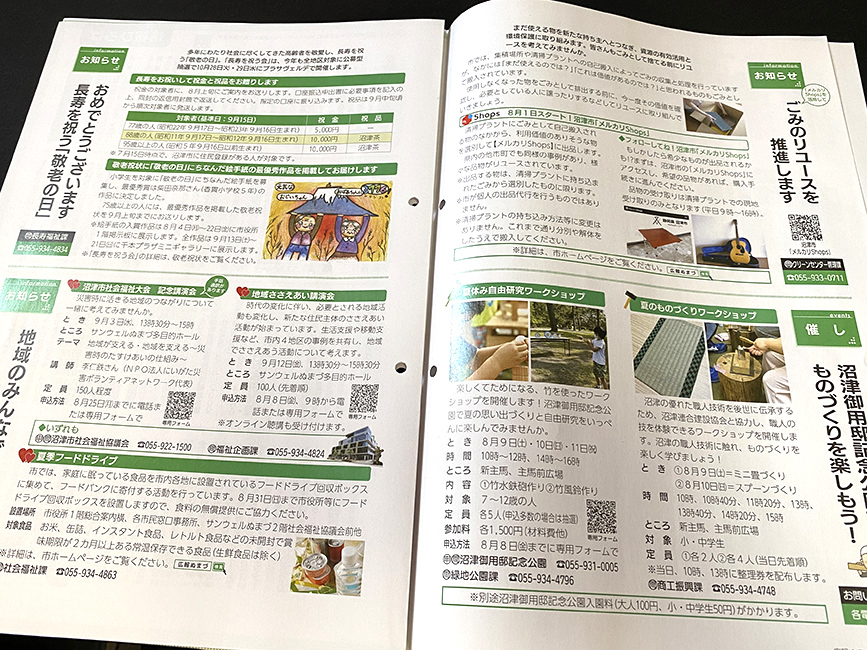 8月に入って暑さもピーク。ちょっと外に出かけたくないなーってときは、沼津の情報をゲットして、ここぞ!というときにお出かけするため、エアコンの聞いた部屋で広報ぬまづを読むのもいいかもしれません。