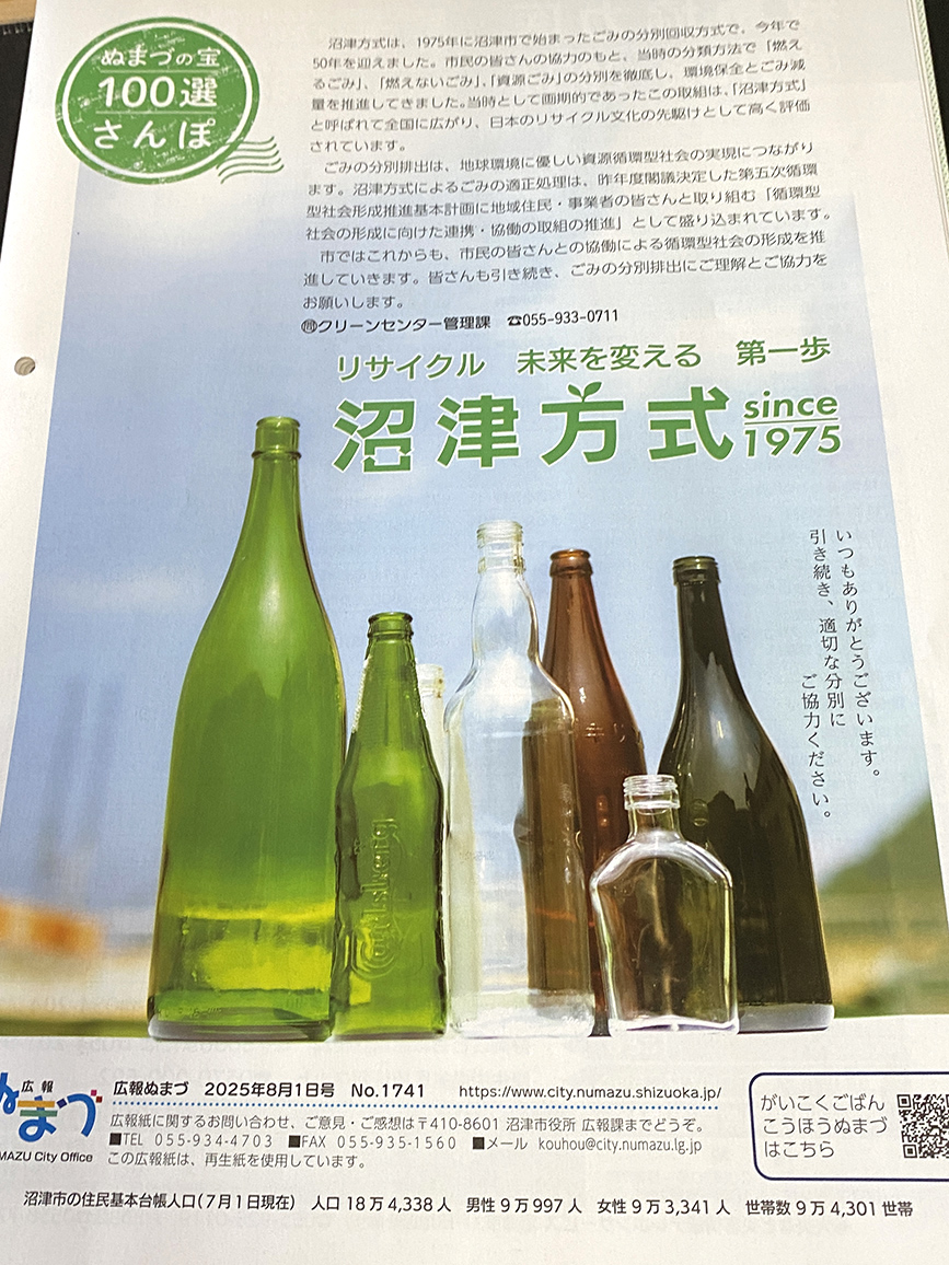 そして最終面には、恒例のぬまづの宝100選さんぽ。今年で50周年を迎える、ごみの分別方式沼津方式について。ガラス瓶がきれいに写真におさめられていますが日本酒の一升瓶とか、瓶ビールの茶色びんとか、手前のやつはカールスバーグの瓶っぽいなあ。撮影のために全部飲んだのかしら…。