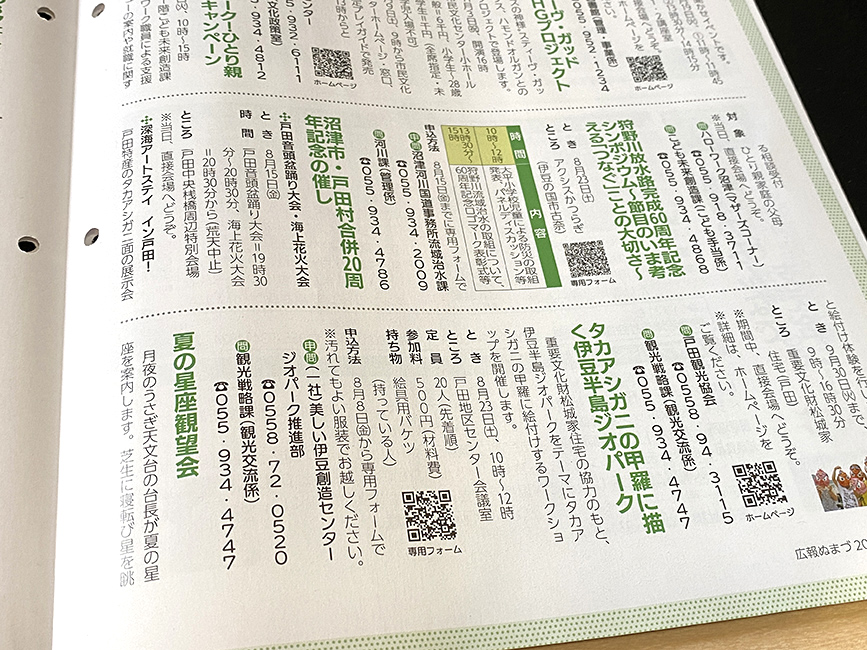 情報ひろばにもまだまだ夏を楽しめそうな記事が盛り沢山。戸田地区ではタカアシガニのお面の絵付けが、それぞれ別イベントで体験できちゃうみたい。タカアシガニ推しがすごいな。戸田の特産だからですね。