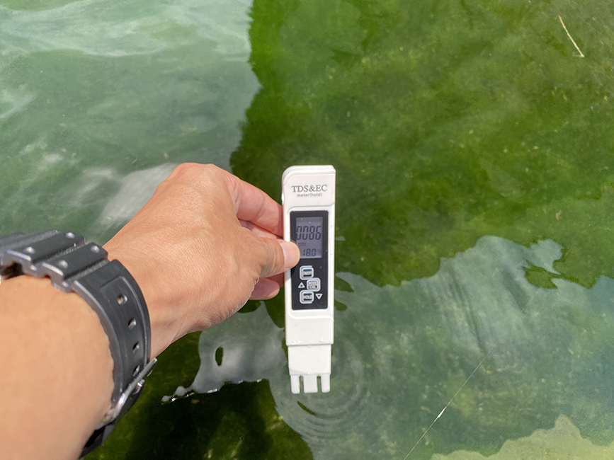 緑色の藻がふさふさと茂っていますが、透明度は高め。ちょっとおじゃまして水中動画を撮影してみました。水中にも酸素がたっぷり、という感じですね。