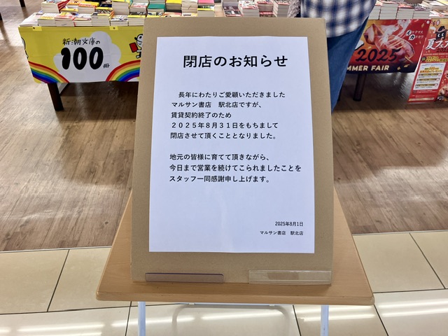 こちらのマルサン書店駅北店、8月31日で閉店なんですって。