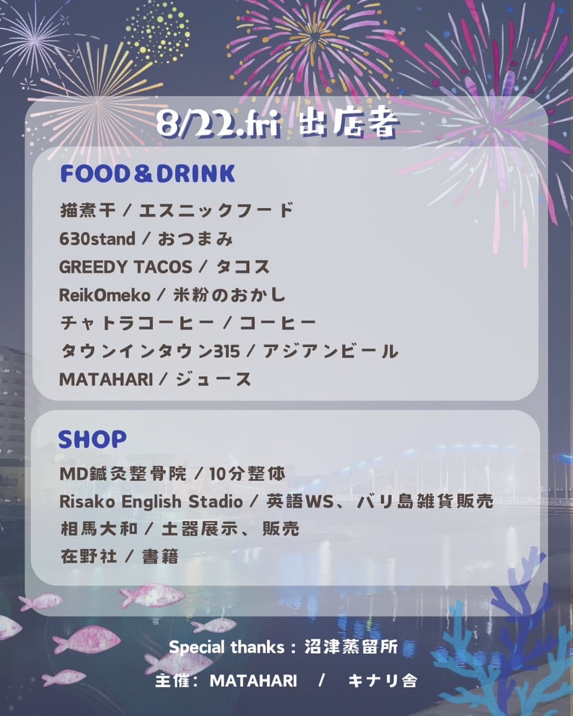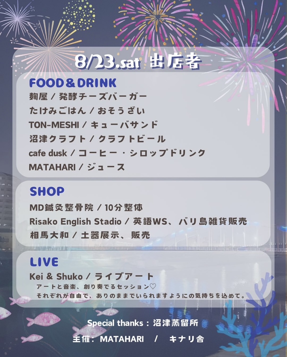 ※小雨決行、予備日はなしです雨天中止の判断は8月20日(水)18時に行います🍬開催場所かのがわ風のテラス ( THE CHAMBER 前 )( 〒410-0802 静岡県沼津市上土町8 )